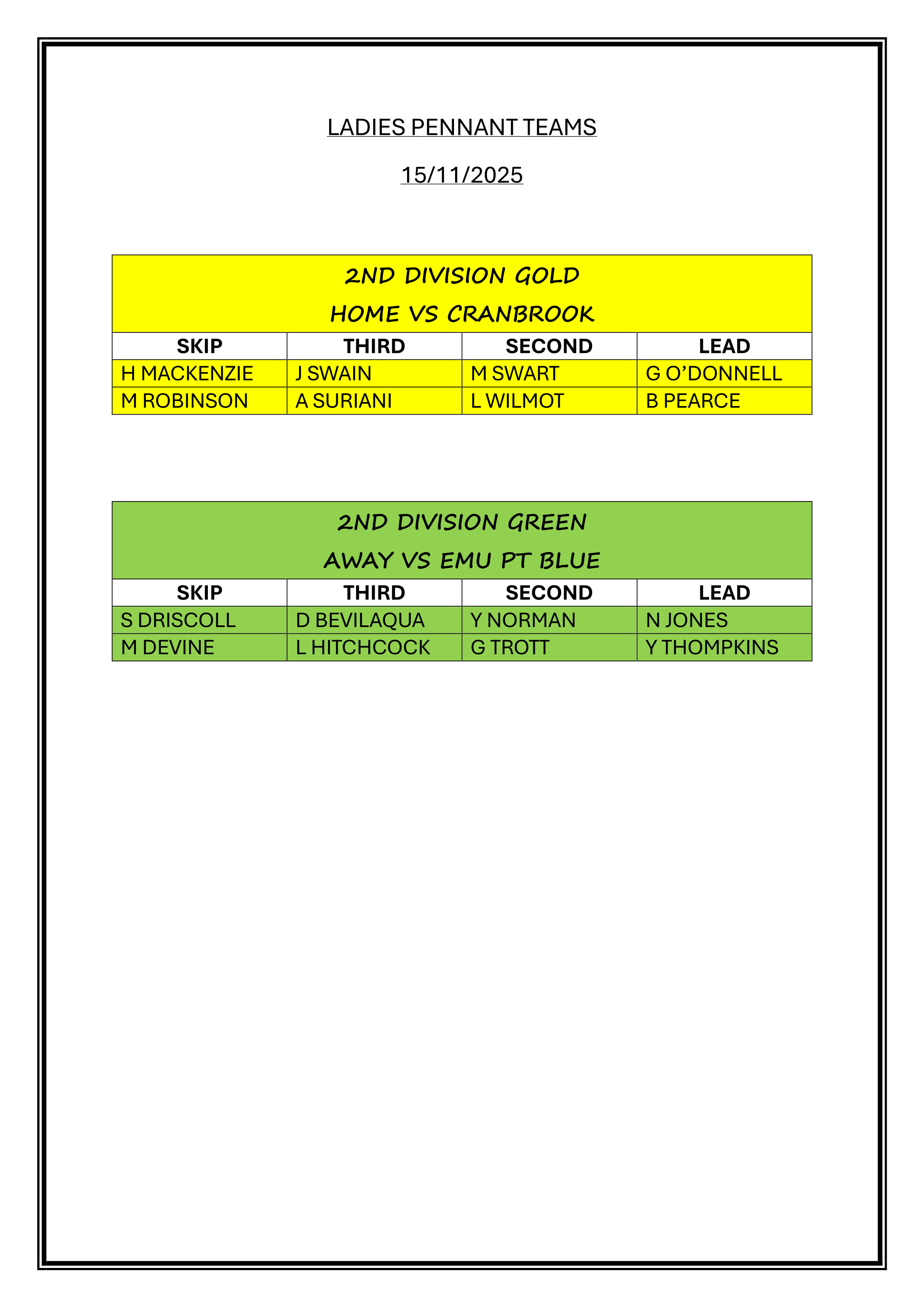LADIES SECOND DIVISION RESULTS & LADDER 2025/26...…CLICK HERE