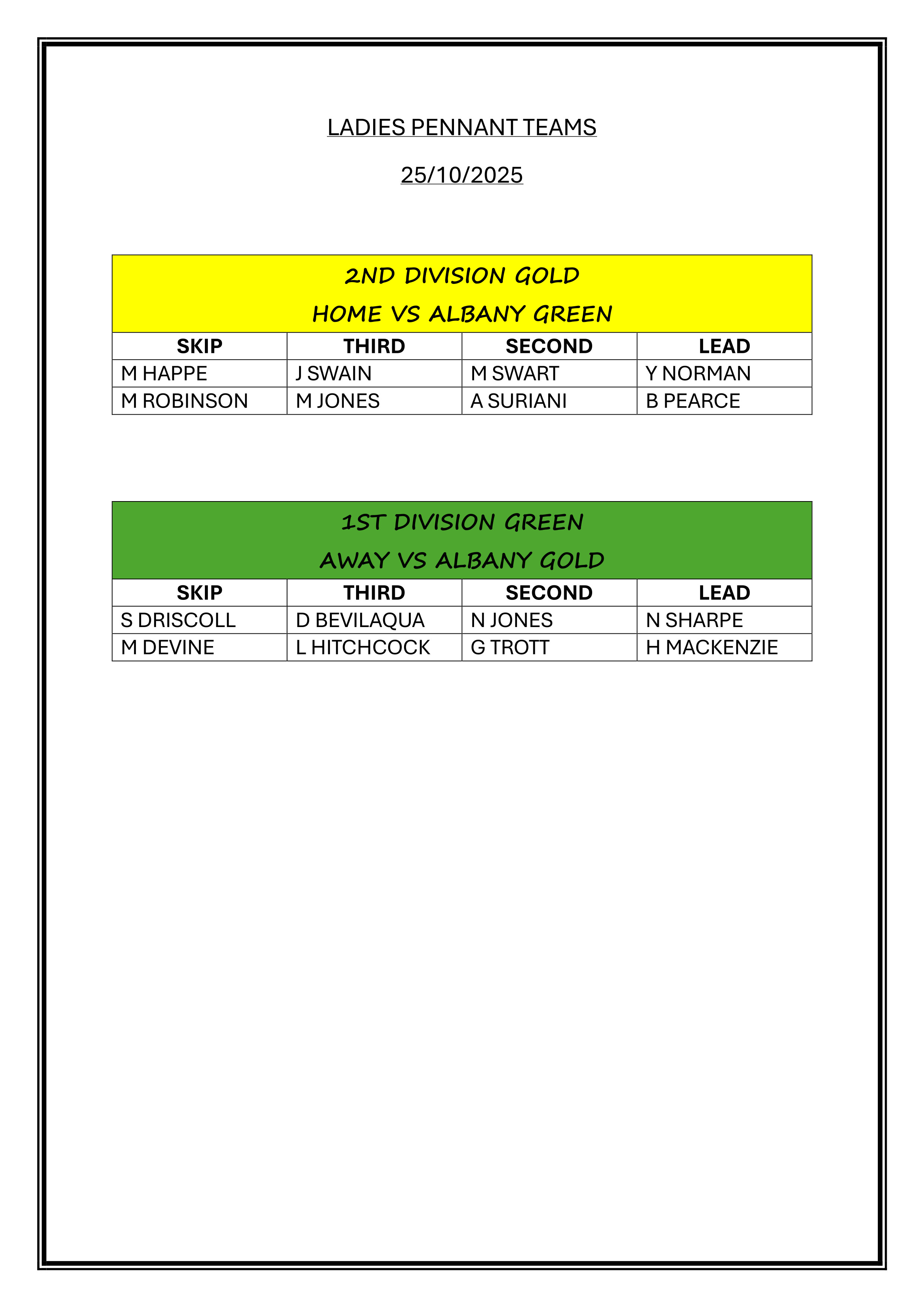 LADIES SECOND DIVISION RESULTS & LADDER 2025/26...…CLICK HERE